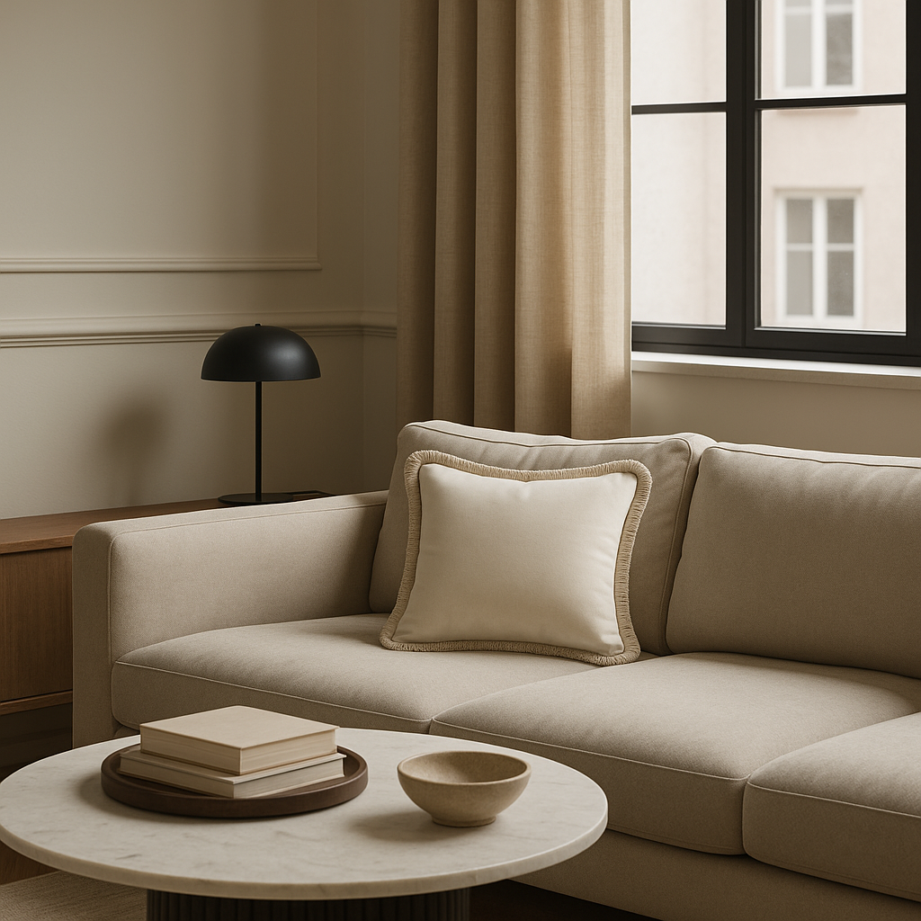 Velvet cushion whit fringes. Elegant, timeless, and refined. This square cushion is meticulously handcrafted in Italy using premium velvet, a high-performance fabric with a smooth and luminous finish. A delicate viscose fringe frames the edges, adding a sophisticated decorative detail with understated charm.