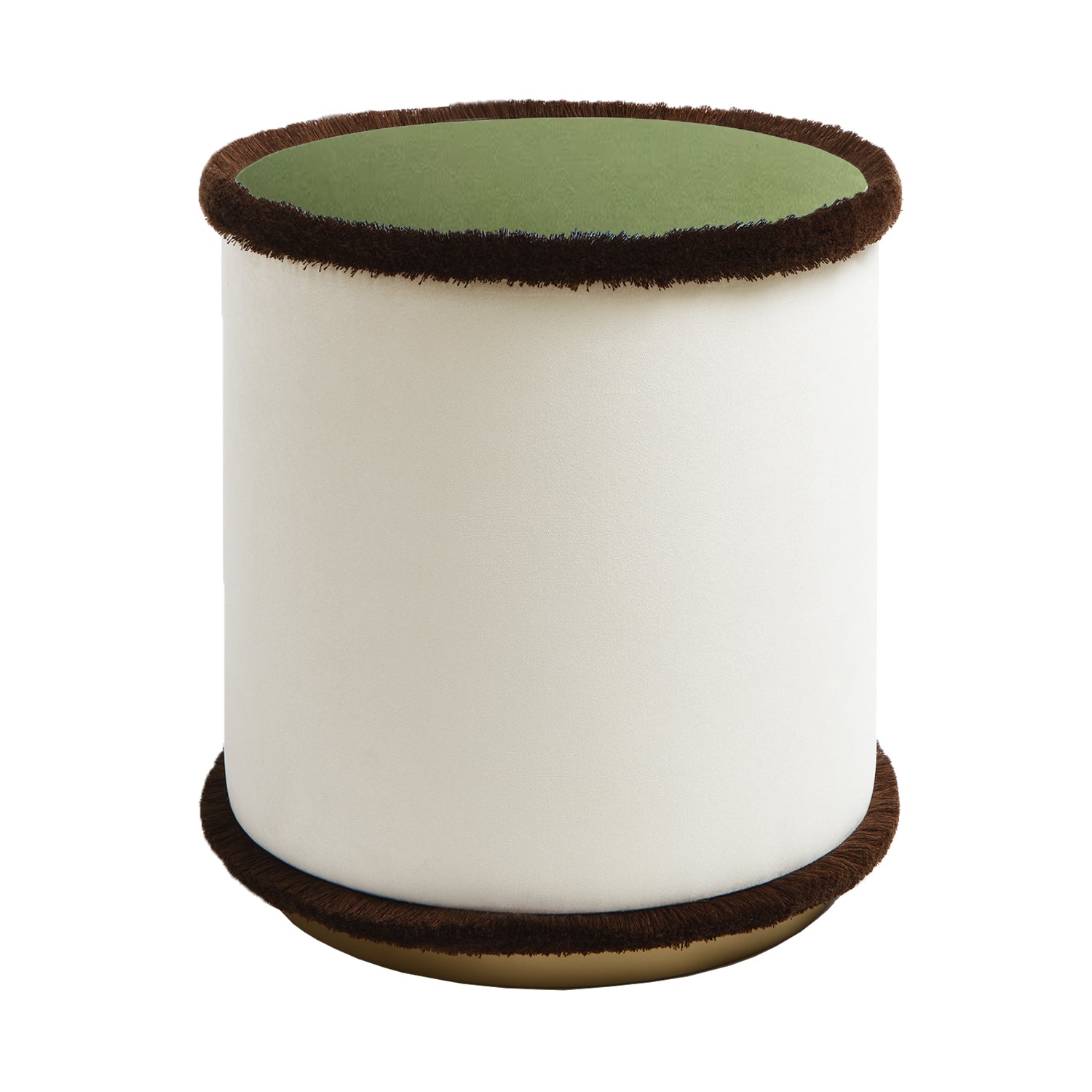 This cylindrical pouf embodies a contemporary and essential design vision. Upholstered in a soft, luminous ivory velvet, it is enhanced by a striking brick-colored seat. The black fringes, precisely applied along the top and bottom edges, elegantly trace its circular silhouette, echoing the visual harmony of Bauhaus-inspired geometry.