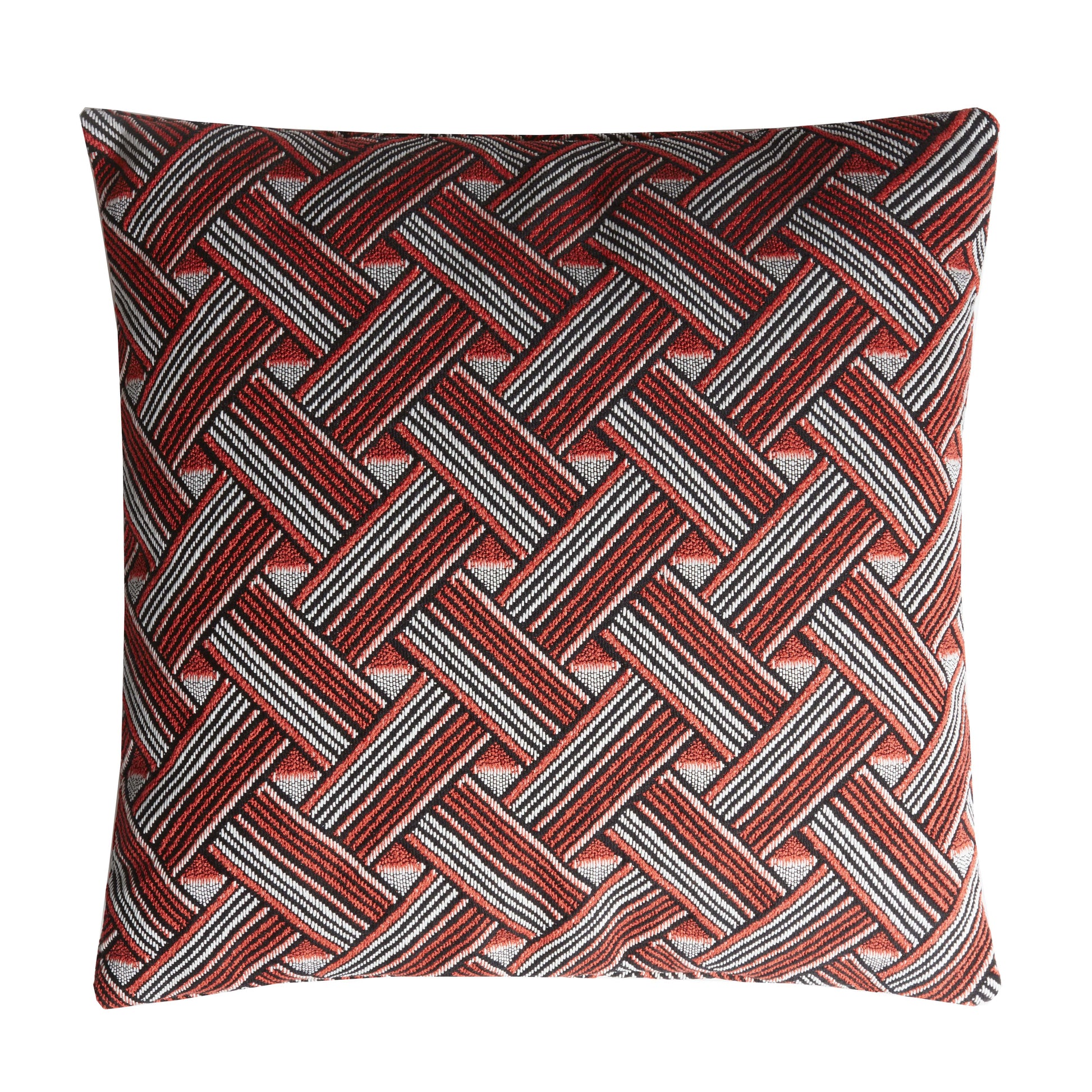 Cushion realizzed with graphic weave with architectural rhythm defines the surface of this cushion, where textile segments interlace with both precision and fluidity. The pattern, composed of linear motifs that intersect with near-mathematical clarity, evokes the charm of classical flooring reimagined through a contemporary lens. Its tactile relief adds depth and movement, turning the fabric into a visual play of light and shadow, of density and openness. Ideal for interiors seeking a balance between structure and ornament, this cushion is a couture accent that engages in dialogue with the most refined architectural settings.