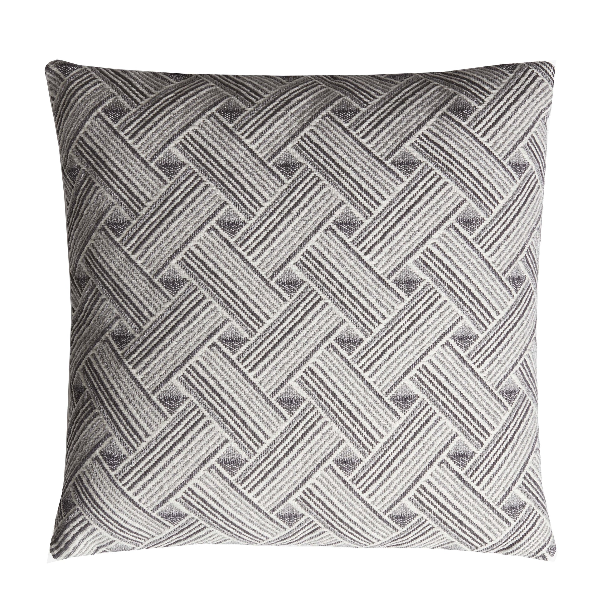 Cushion realizzed with graphic weave with architectural rhythm defines the surface of this cushion, where textile segments interlace with both precision and fluidity. The pattern, composed of linear motifs that intersect with near-mathematical clarity, evokes the charm of classical flooring reimagined through a contemporary lens. Its tactile relief adds depth and movement, turning the fabric into a visual play of light and shadow, of density and openness. Ideal for interiors seeking a balance between structure and ornament, this cushion is a couture accent that engages in dialogue with the most refined architectural settings.